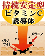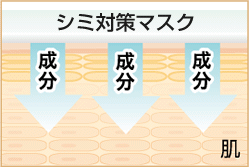 『薬用 シミ対策マスク』には、「持続安定型」ビタミンC誘導体を配合。ビタミンCを壊すことなく角層に届け、長時間とどまり続けます。さらに、シミのもと「メラニン」の生成を抑え、シミ、ソバカスを防ぎます。